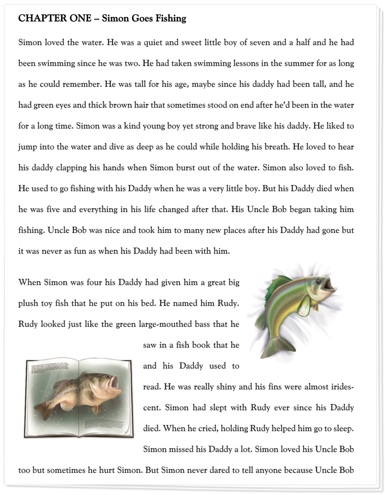 A story of a little boy who loves to fish and swim and is rescued from his abusive uncle by Rudy, a plush talking bass fish toy who magically transforms into a real fish and takes Simon on some fun underwater adventures where he, too, practices using his voice…even employing an imaginary microphone where he can try out saying ‘NO!’”
